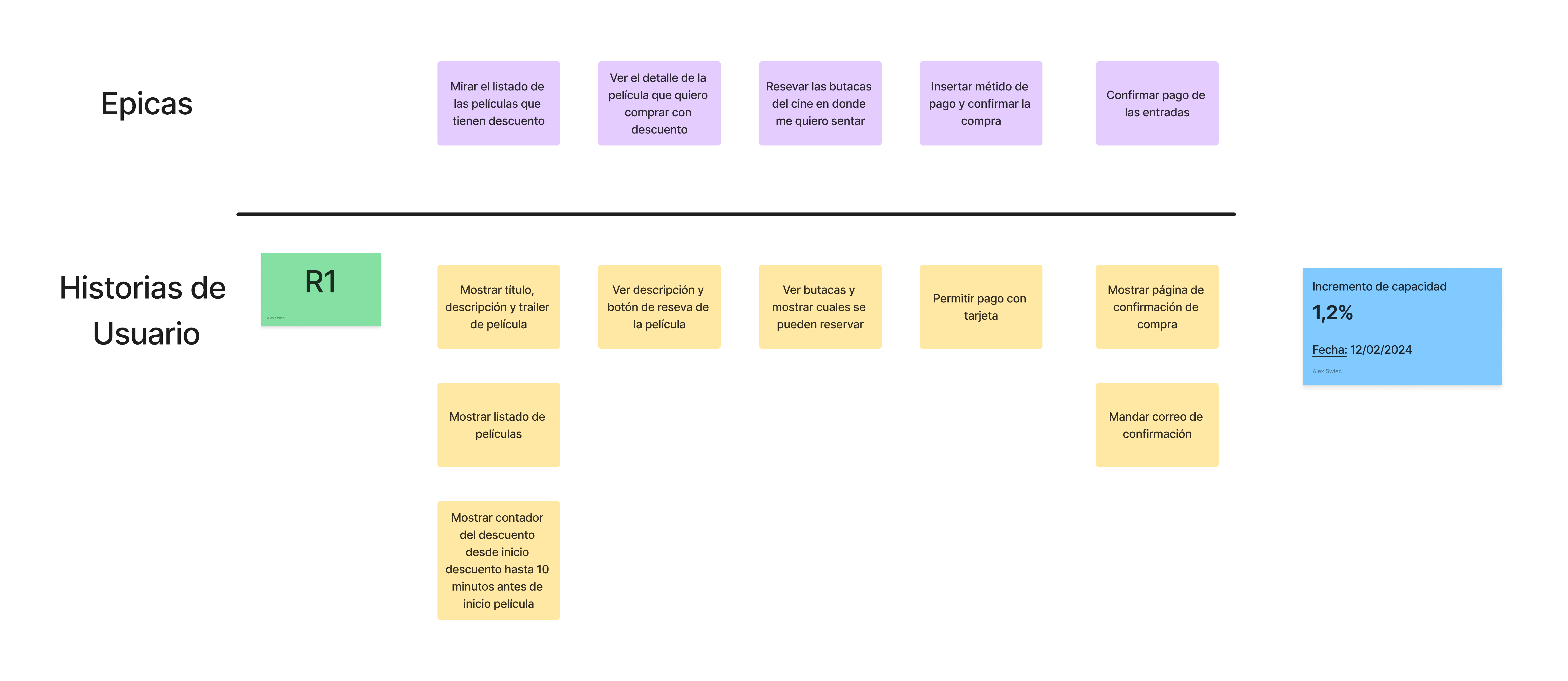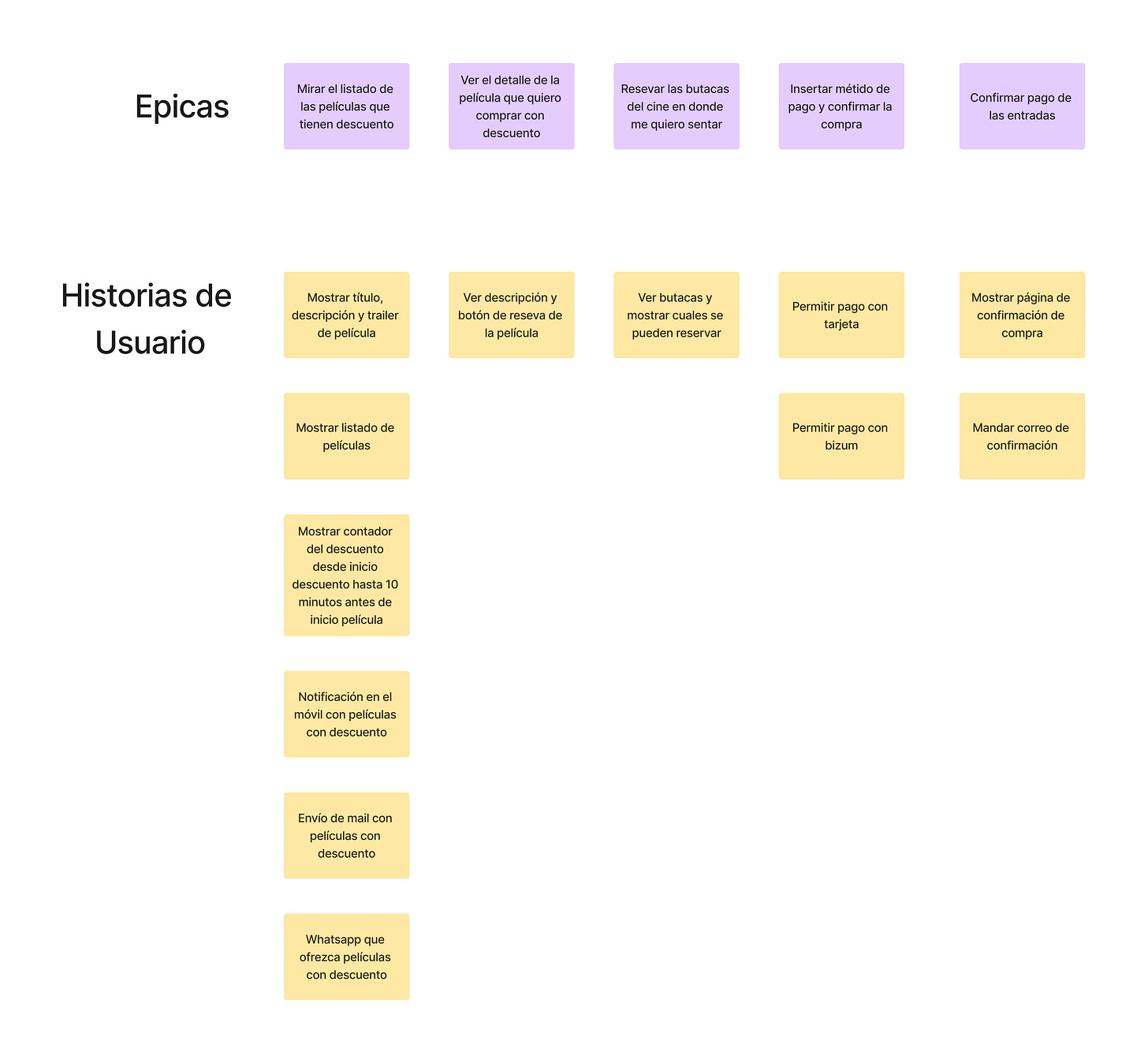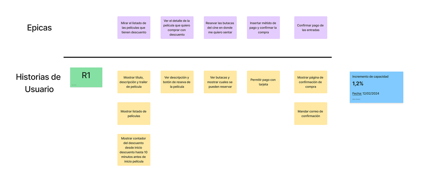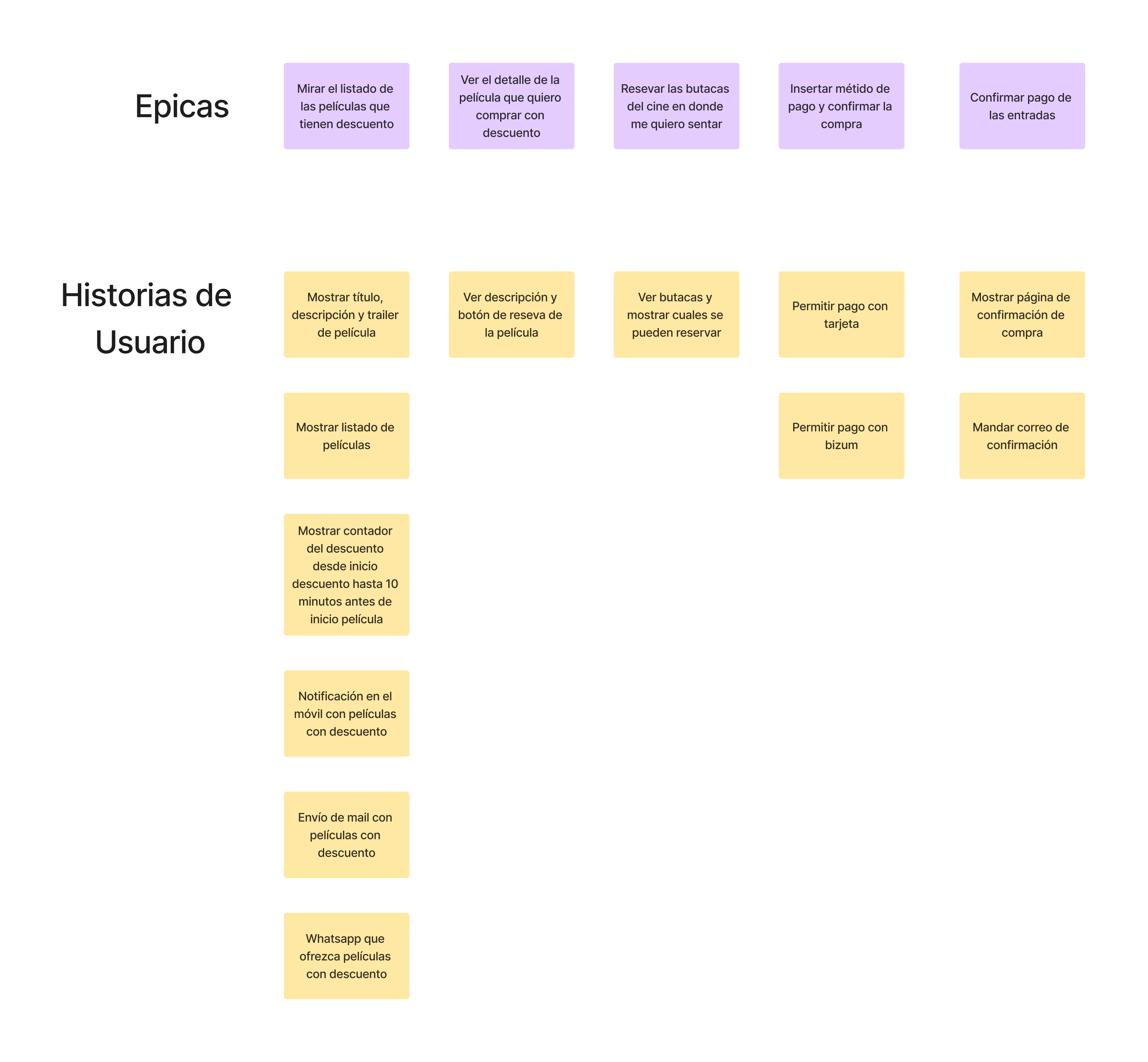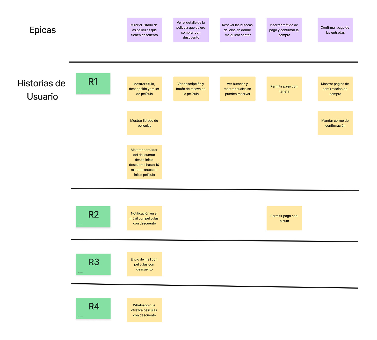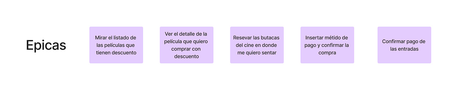 En el ejemplo de abajo vemos las historias de usuario asociadas a cada una de las épicas, que se añaden al flujo del usuario previamente definido.