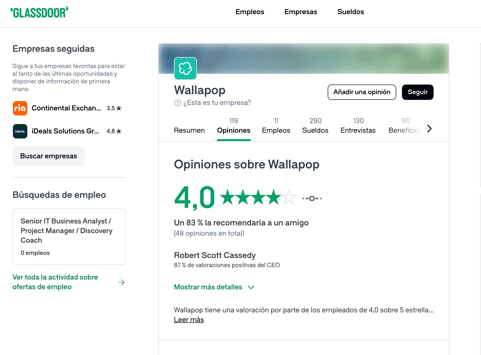 En Glassdoor podemos a muchísimas empresas y ver qué comentan los empleados que han trabajado en la empresa sobre la empresa así como una valoración general del CEO.