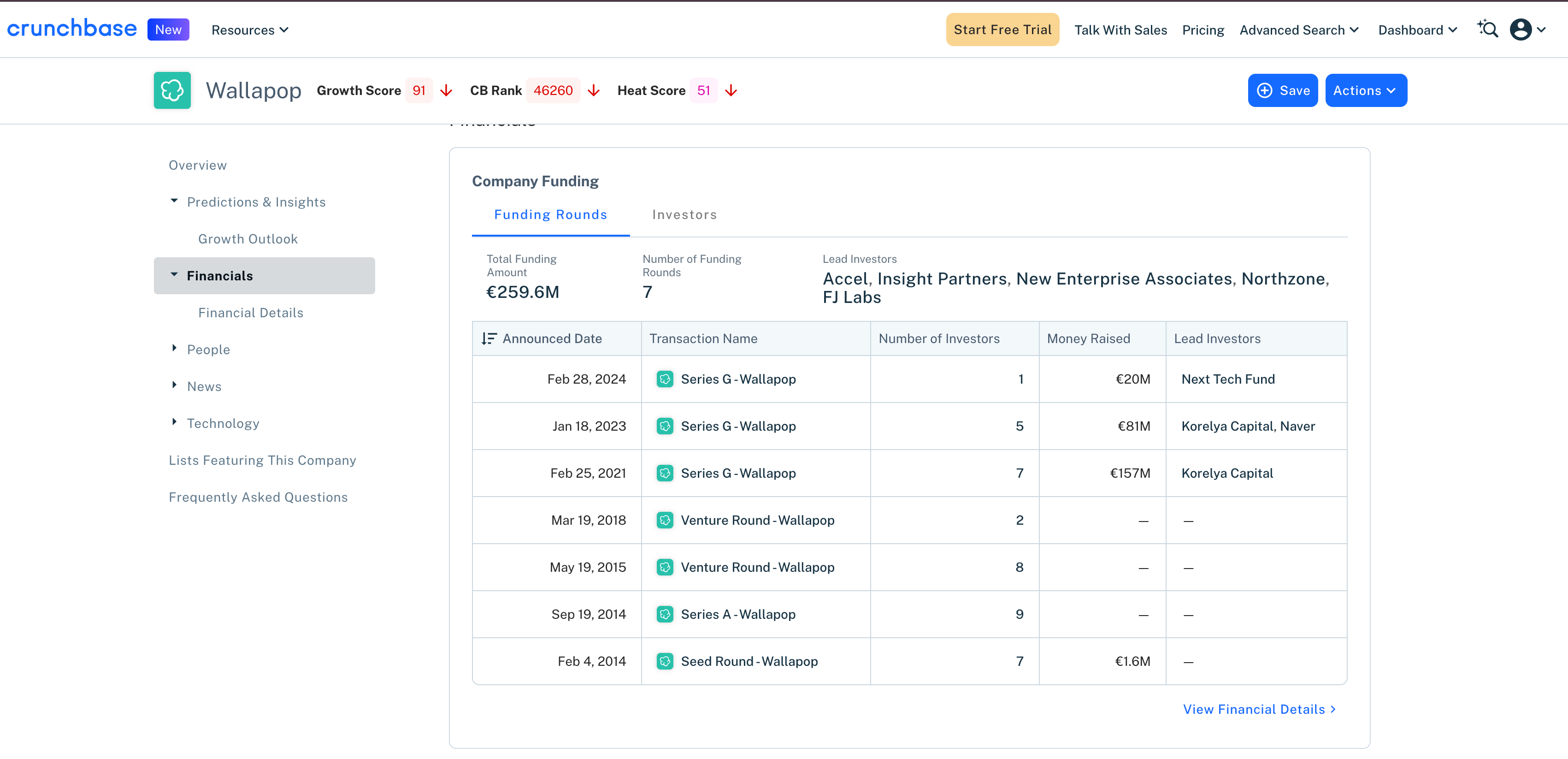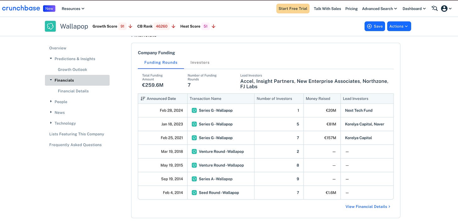 - Si la empresa es una scaleup o privada lo mejor es que busques los números en páginas como Crunchbase en donde podrás ver muchos números financieros así cómo lo “caliente” o no que está una empresa en el mercado - Aquí tienes un ejemplo de una empresa como WALLAPOP en donde se pueden ver claramente las rondas de inversión que ha tenido a lo largo de su historia