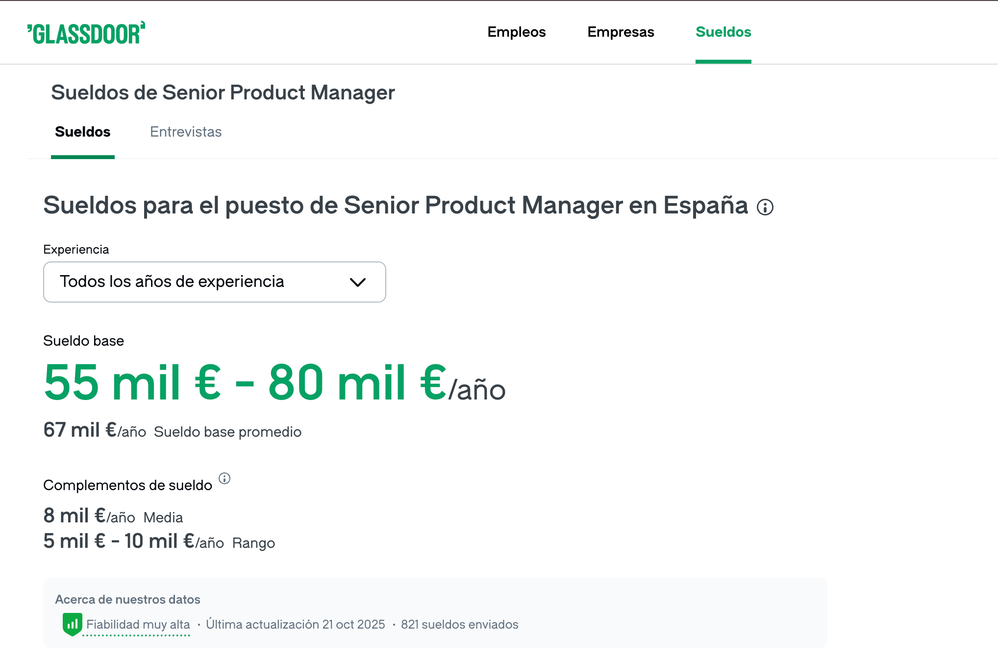 - En España en general: salario medio ~ €74.500/año para Senior Product Manager. (Glassdoor)